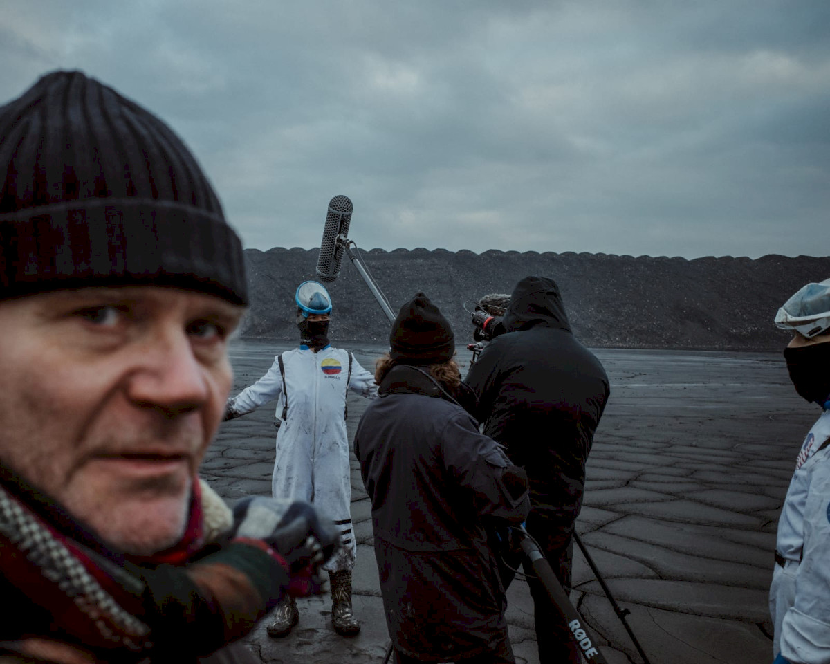 [Behind the scenes of a film set on a raw, volcanic landscape; a film crew is recording a person in a white suit and helmet, while in the foreground a man in a cap looks toward the camera.]