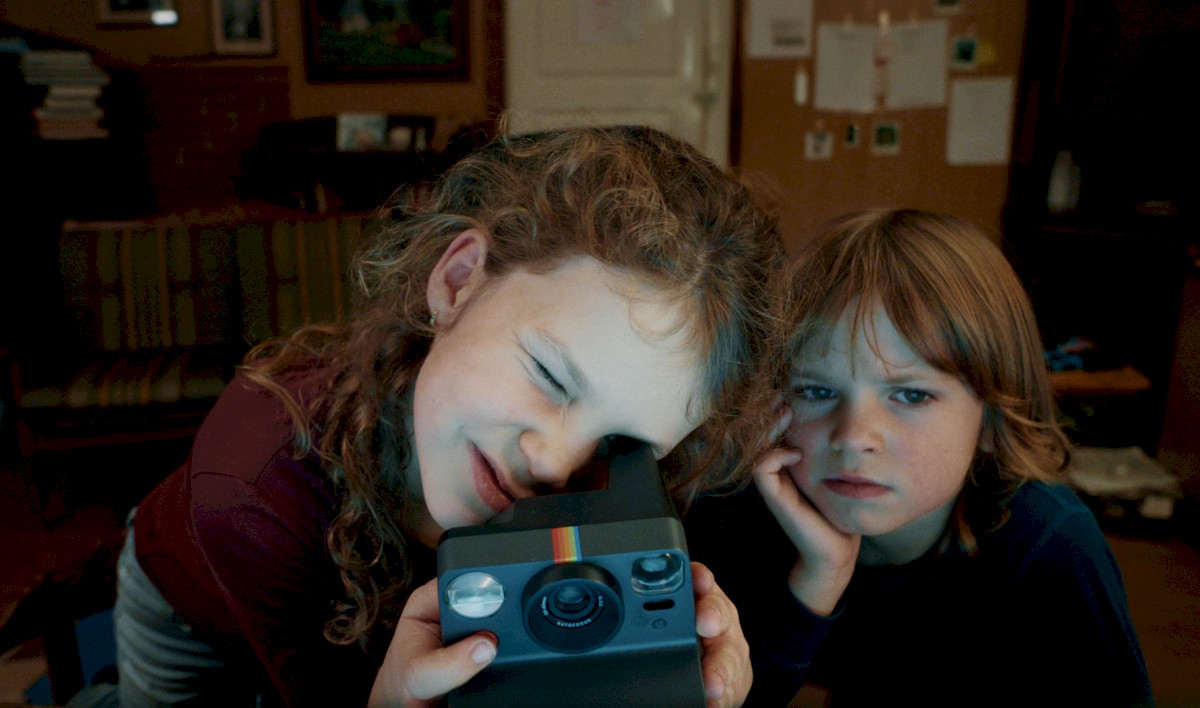 [Two children sit at home and look at an instant camera; the girl puts her eye to the viewfinder while the boy watches with curiosity.]