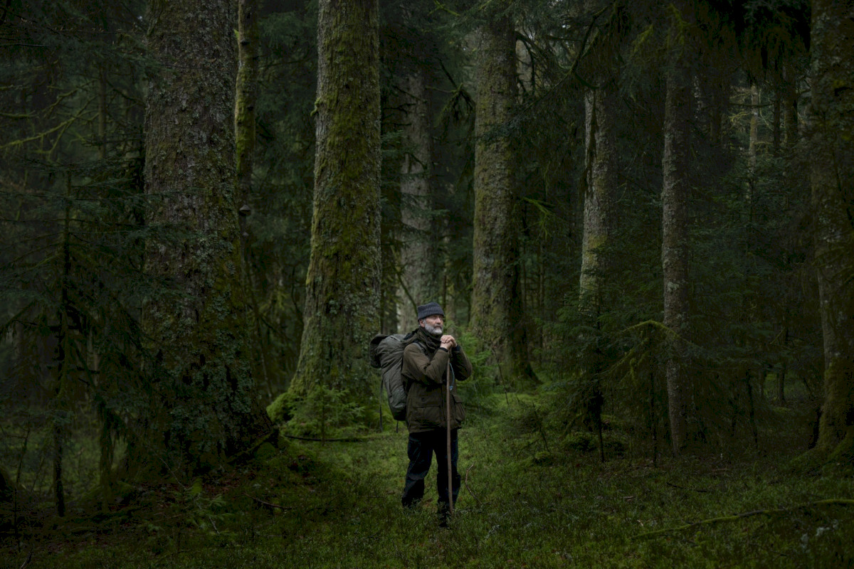 An older man with a backpack and a walking stick stands in a dense, green coniferous forest, surrounded by tall, moss-covered trees.