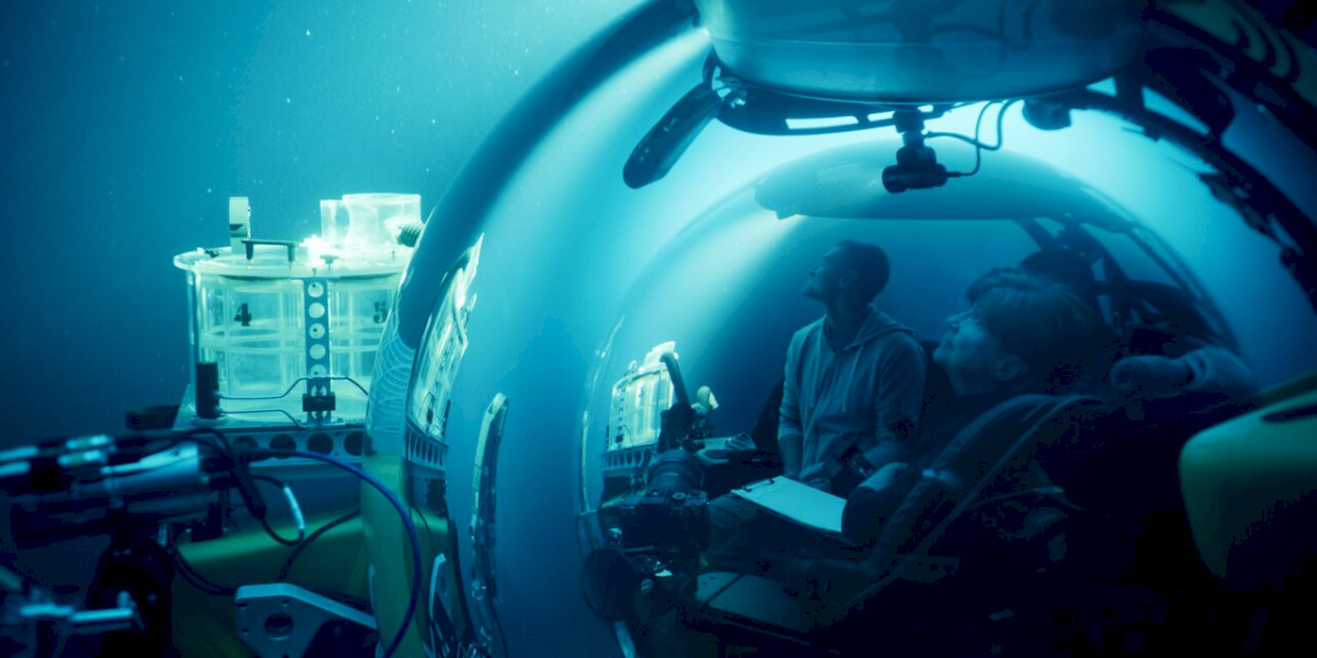 [The interior of an underwater research capsule; two people sit in a glass cabin observing the surrounding blue water and scientific equipment.]