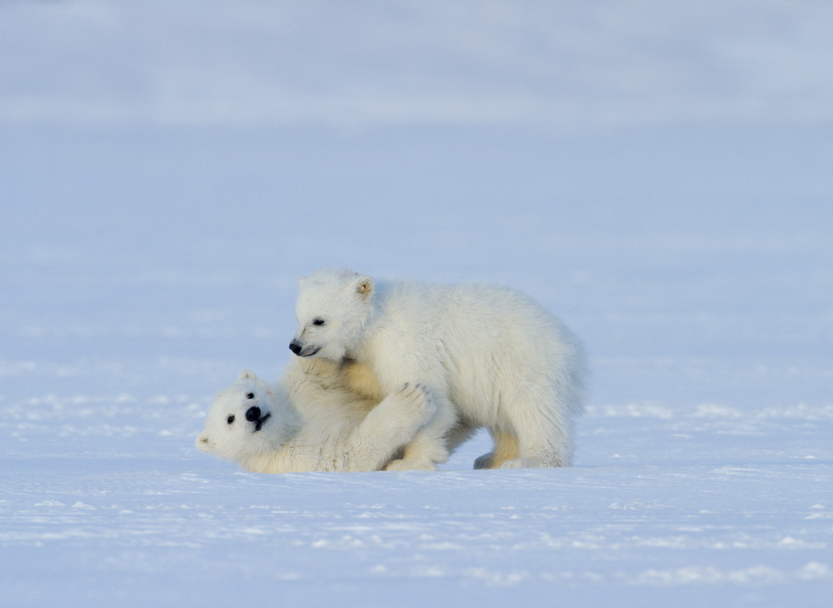 [Two white polar bear cubs play in the snow - one lies on its back while the other leans over it.]