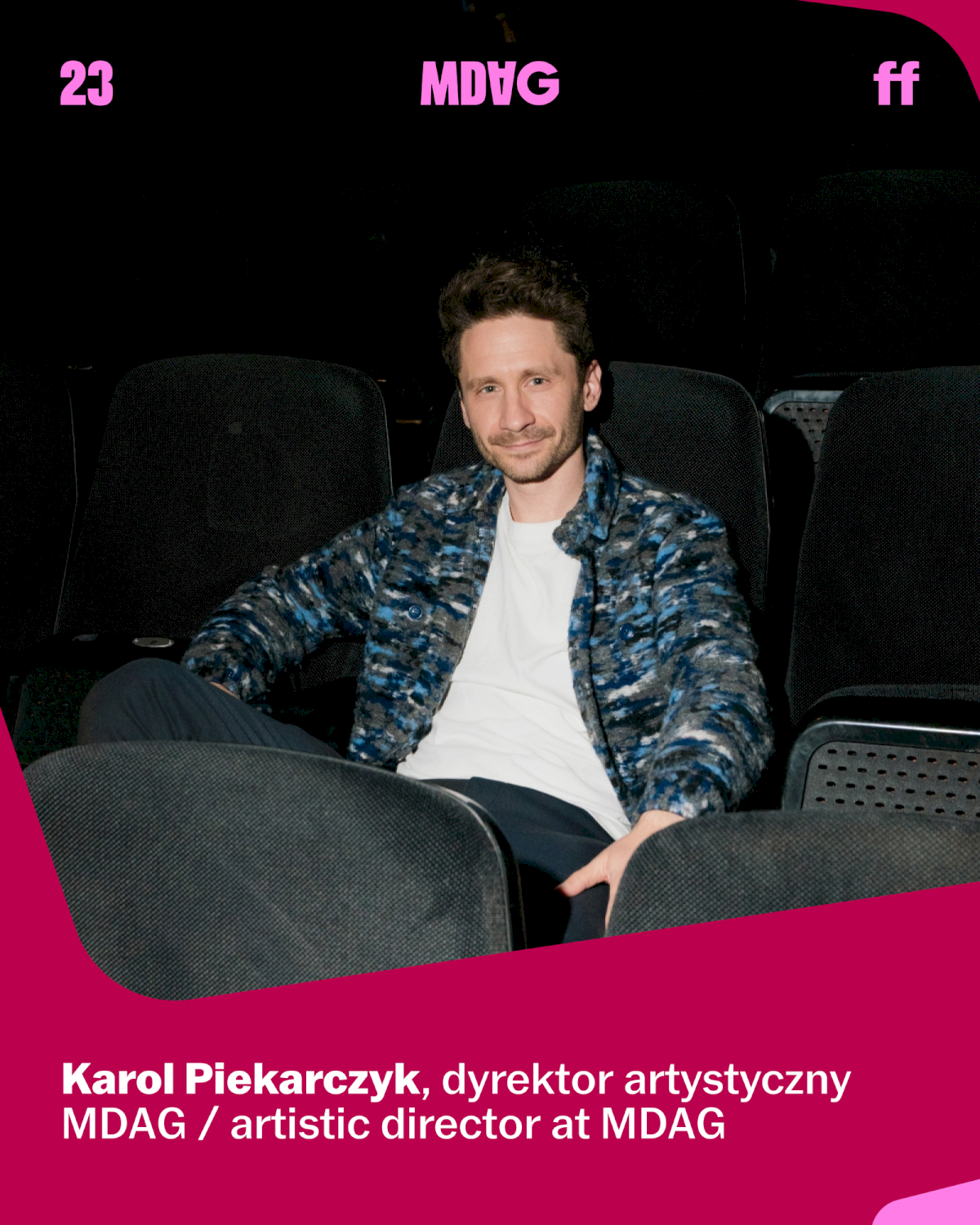 [Graphic: in the photo, a man sits in a black armchair in a cinema hall; text: Karol Piekarczyk, Artistic Director at MDAG]