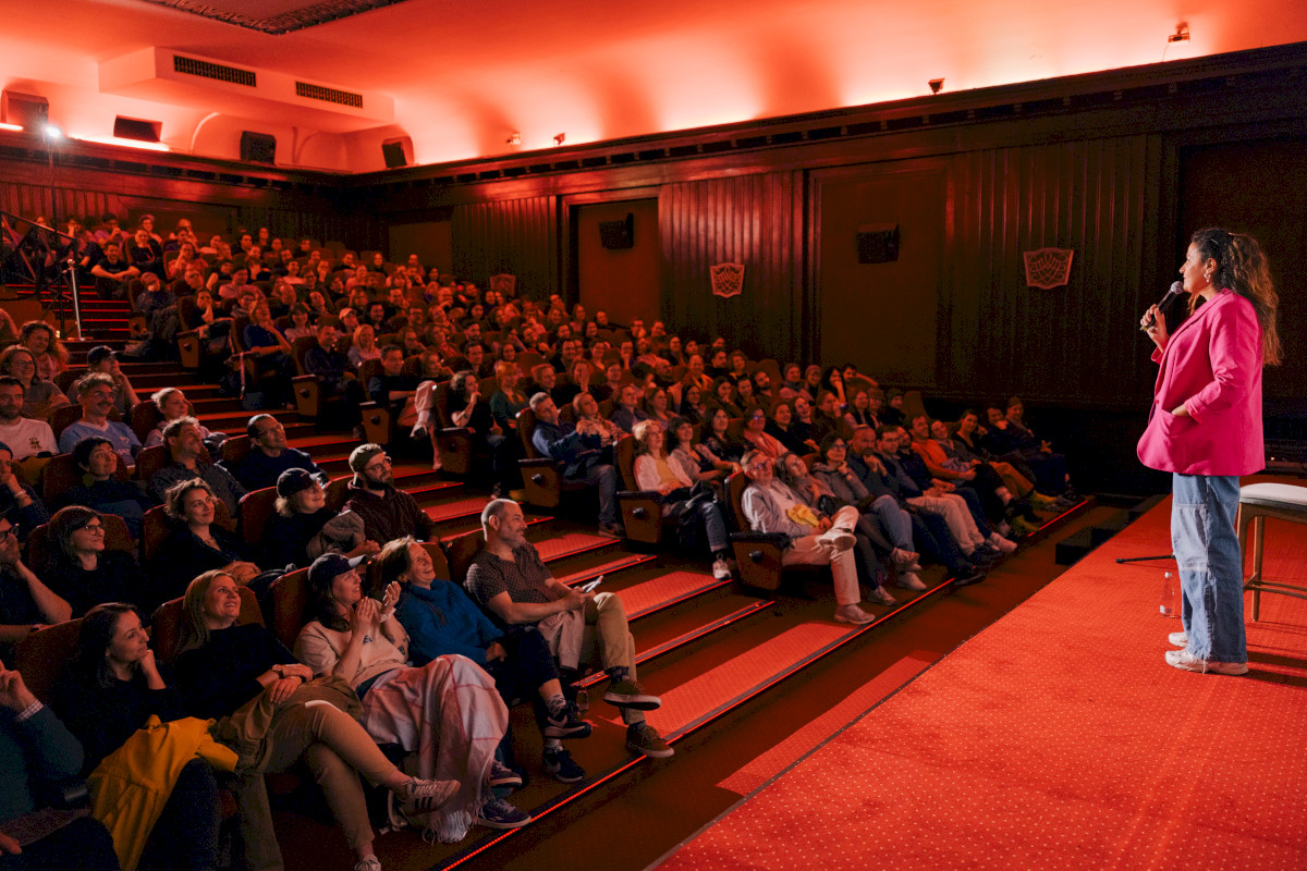 [Pełna sala kinowa, na scenie występuje kobieta]