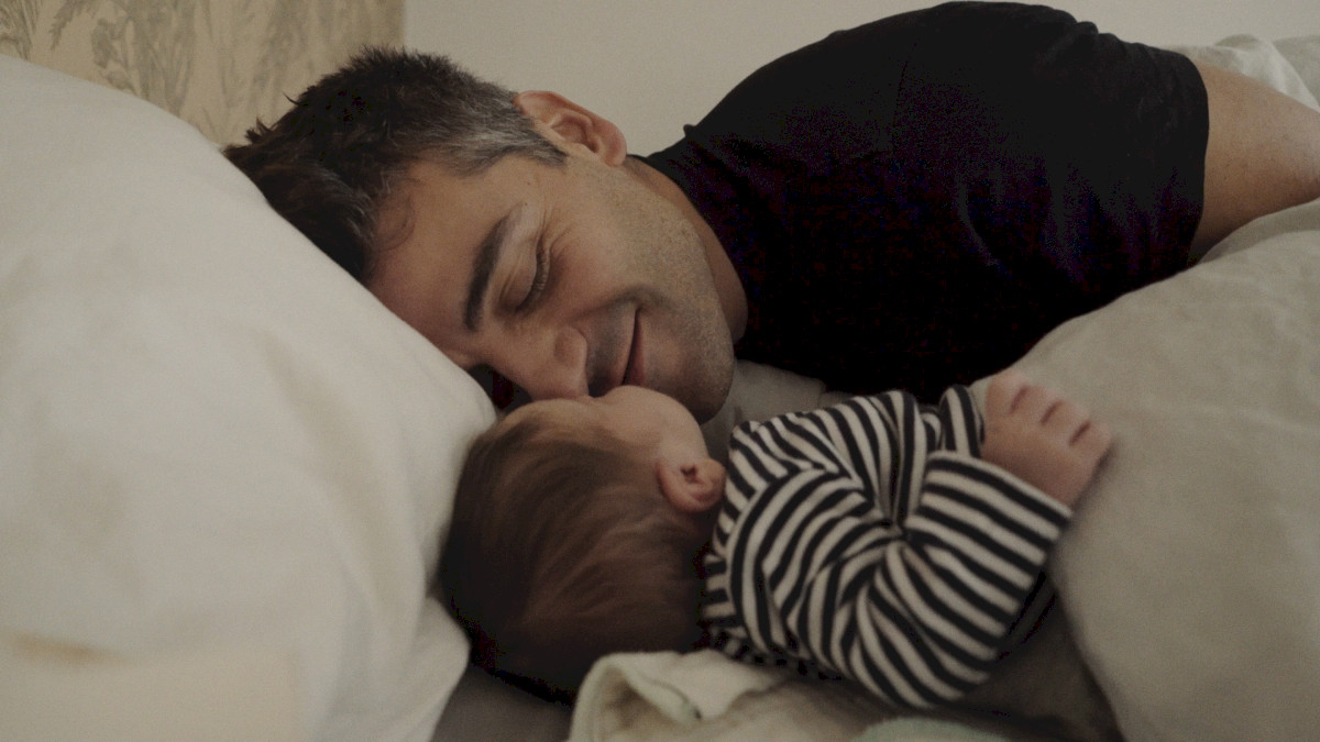 [Ojciec leży z dzieckiem i uśmiecha się do niego]