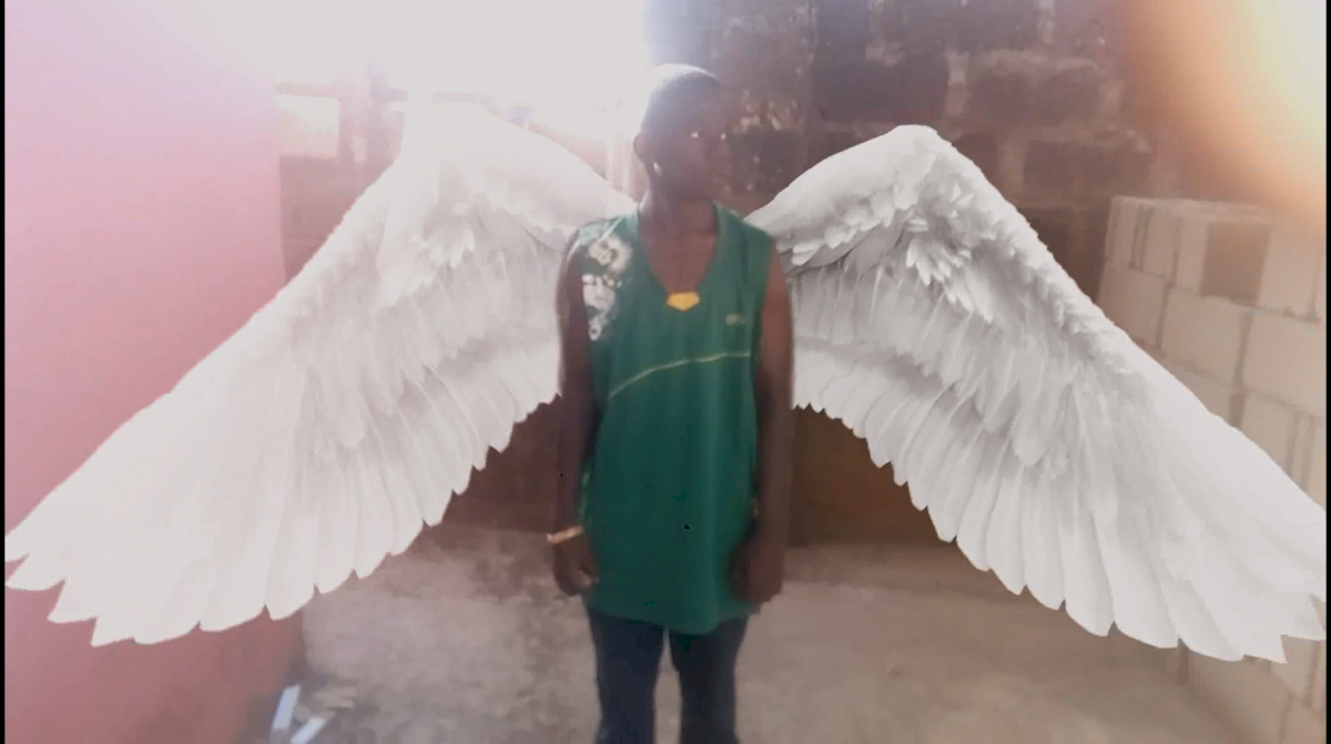 [Czarnoskóry chłopiec w zielonej koszulce ma skrzydła]