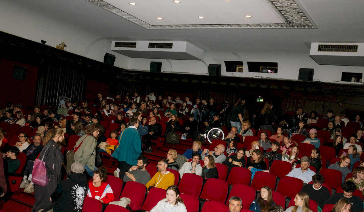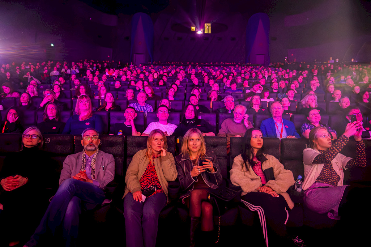 [Zapełnione rzędy w sali kinowej, różowa poświata pada na twarze widzów]