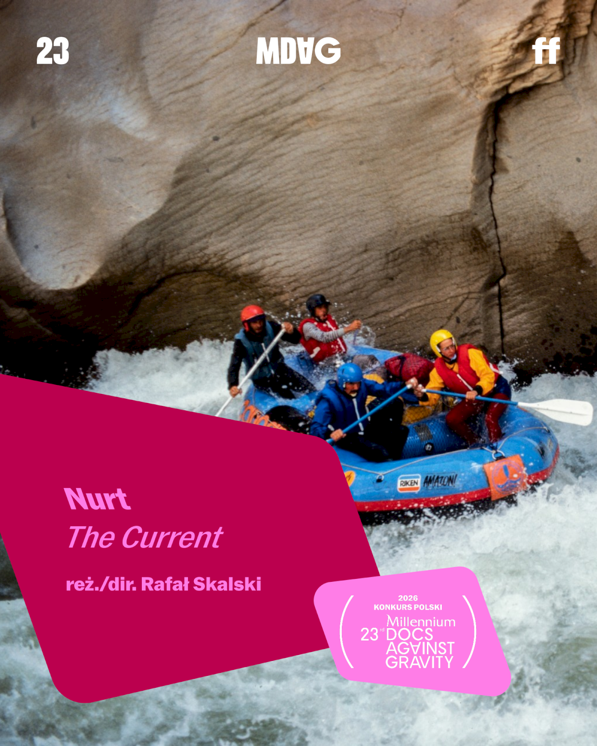 [Grupa osób płynie pontonem przez rwącą rzekę. Grafika promuje film i festiwal MDAG.]