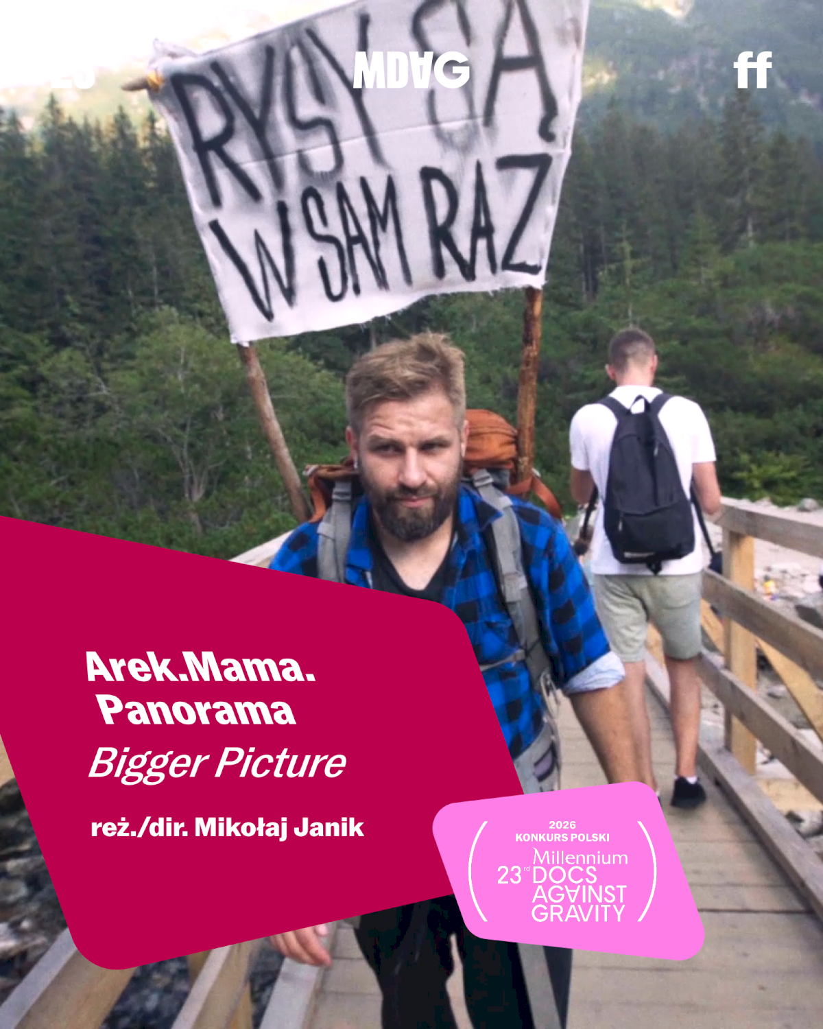 [Mężczyzna z plecakiem niesie transparent na górskim moście, w tle druga osoba. Grafika promuje film i festiwal MDAG.]