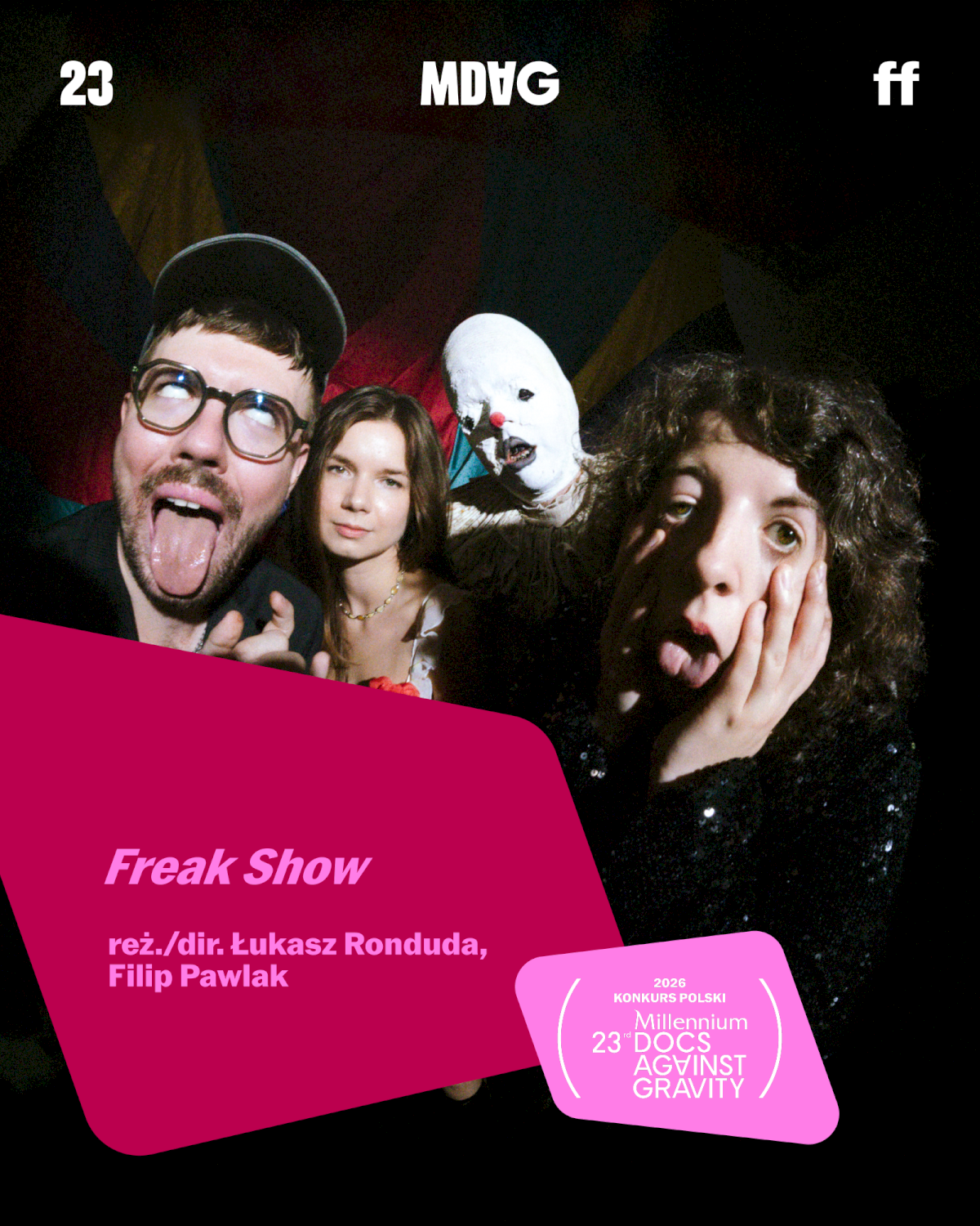 [Cztery osoby pozują do zdjęcia w stylu freak show; jedna w masce, inni robią zabawne miny. Grafika promuje film i festiwal MDAG.]
