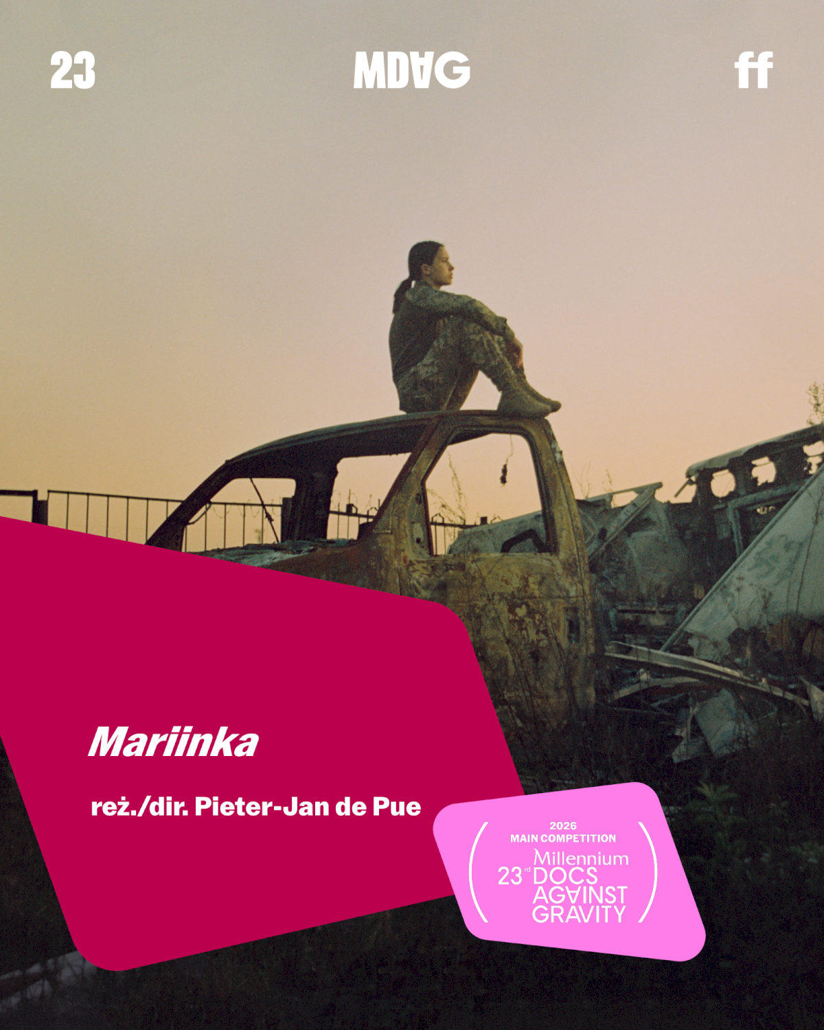 [Grafika: na zdjęciu kobieta w stroju wojskowym siedzi na wraku samochodu o zachodzie słońca, napis: Mariinka, reż./dir. Pieter-Jan de Pue]