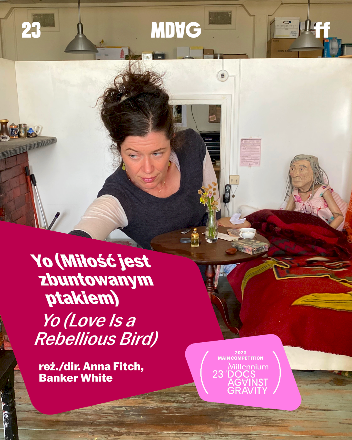 [Grafika: na zdjęciu kobieta otoczona małymi przedmiotami, jak z domku dla lalek; napis: Yo (Miłość jest zbuntowanym ptakiem Yo (Lovie is a Rebellious Bird), reż/dir/ Anna Fitch, Banker White]