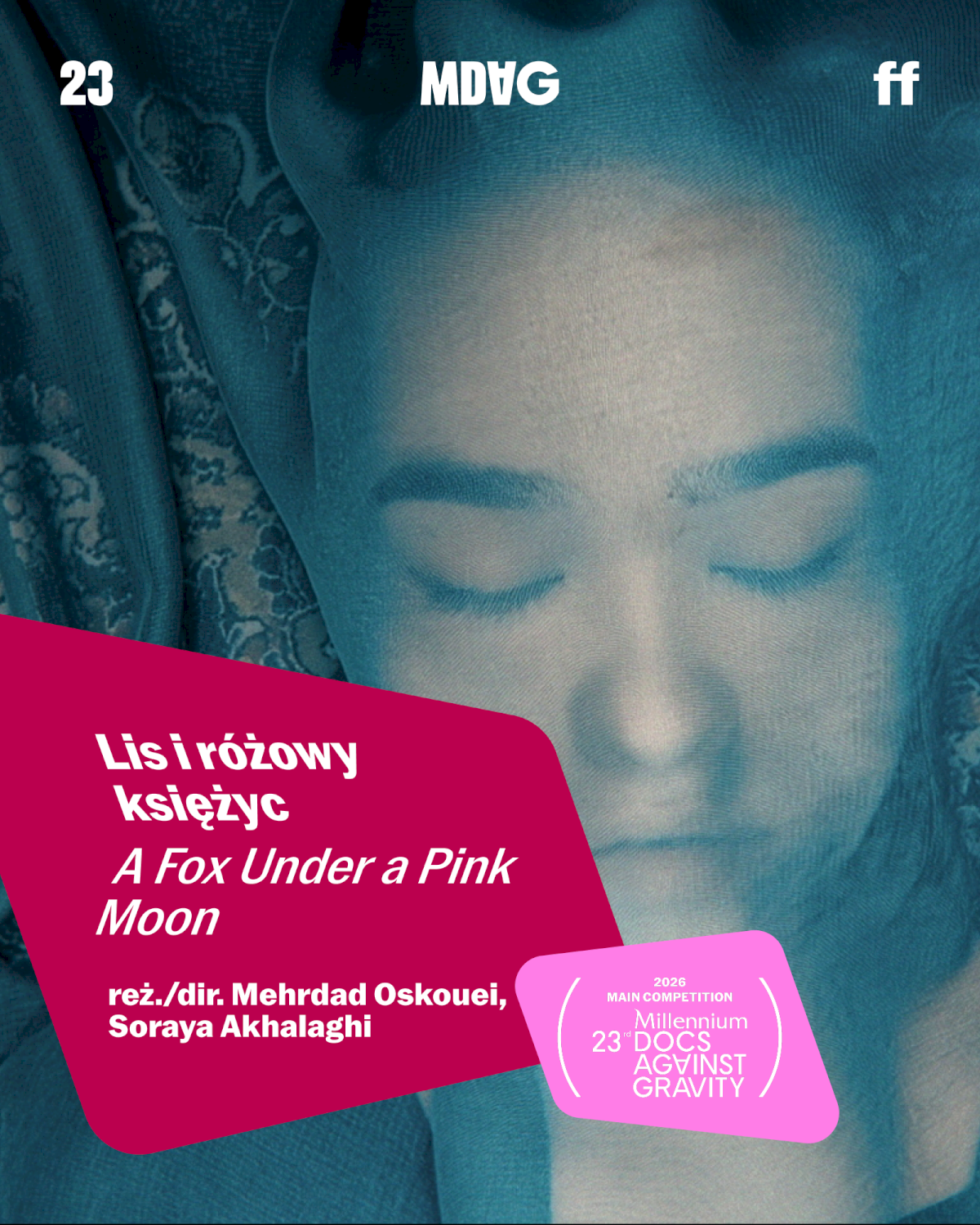 [Grafika: na zdjęciu kobieta przykryta przezroczystym materiałem; napis: Lis i różowy księżyc A Fox Under a Pink Moon reż./dir. Mehrdad Oskouei, Soraya Akhalaghi]