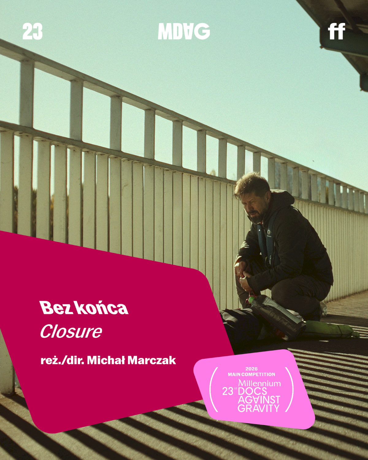[Grafika: na zdjęciu mężczyzna kuca przy barierce na moście; napis: Bez końca Closure, reż/dir. Michał Marczak]