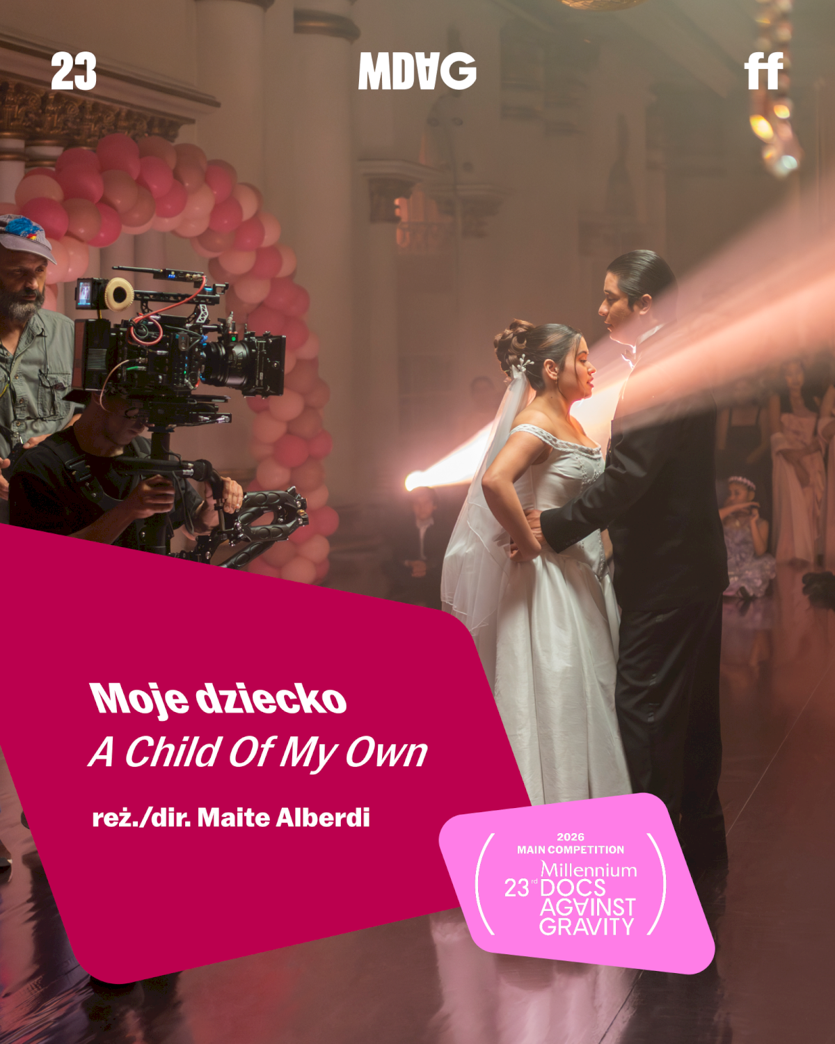 [Grafika: na zdjęciu para młoda tańczy, otoczona kamerzystami, różowe prześwity; napis: Moje dziecko A Child of My Own reż/dir. Maite Alberdi]