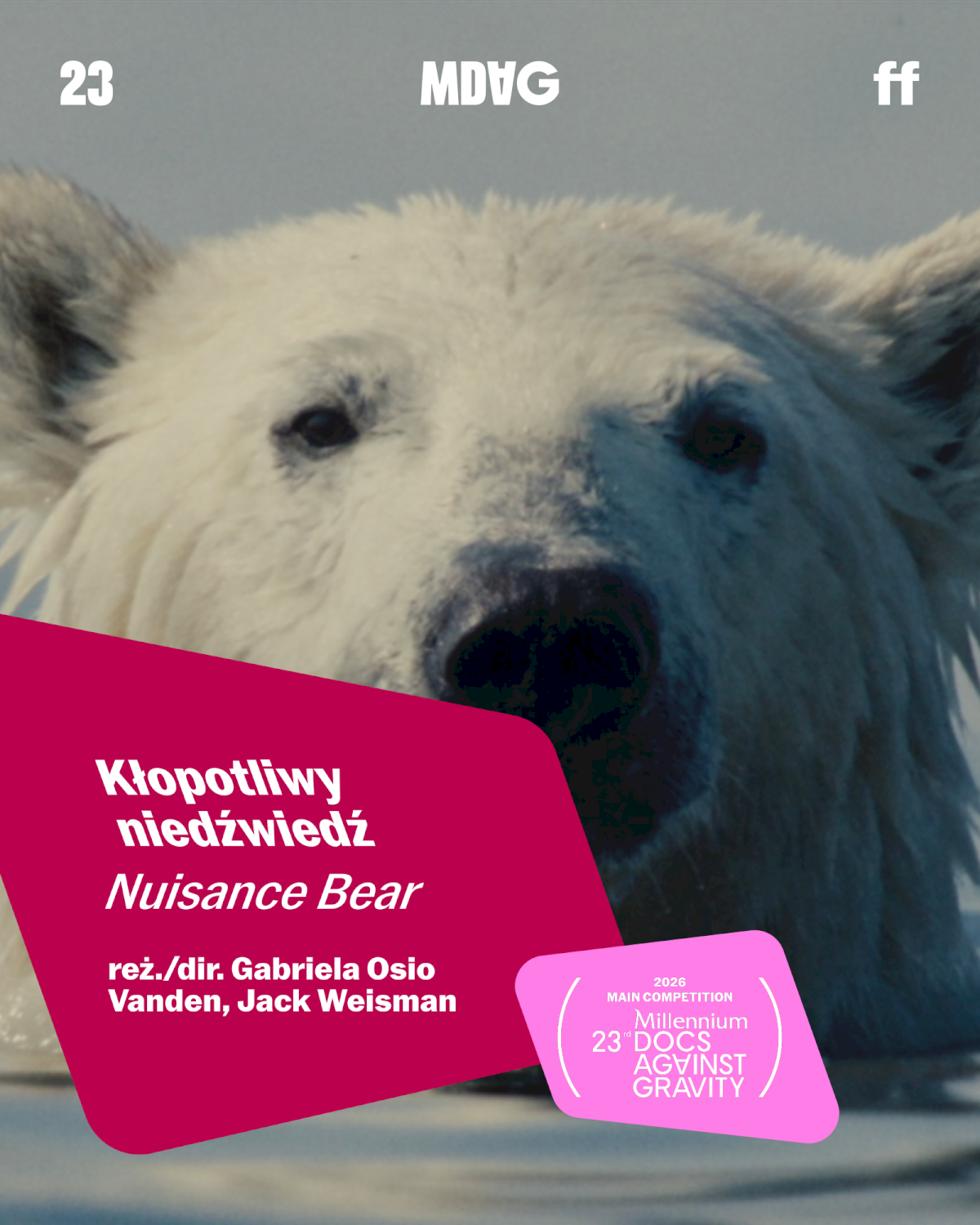 23. MDAG odbędzie się od 8 do 17 maja 2026 roku w kinach w siedmiu miastach (Warszawie, Wrocławiu, Gdyni, Poznaniu, Katowicach, Łodzi oraz Bydgoszczy) oraz od 19 maja do 1 czerwca online na mdag.pl! To największy polski festiwal filmowy i drugi największy festiwal filmów dokumentalnych w Europie, który zgromadził w 2025 roku ponad 181 tysięcy widzów i widzek.
