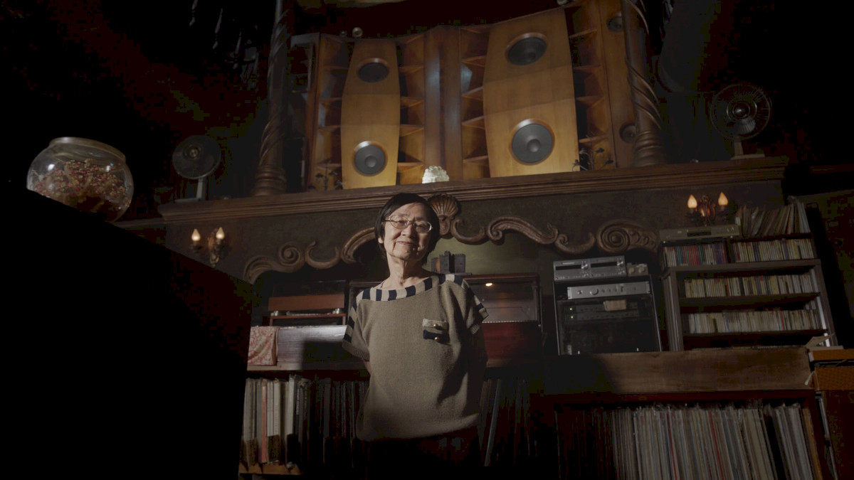 [Starsza kobieta uśmiecha się do obiektywu, otoczona sprzętem dźwiękowym i regałami pełnymi płyt winylowych]