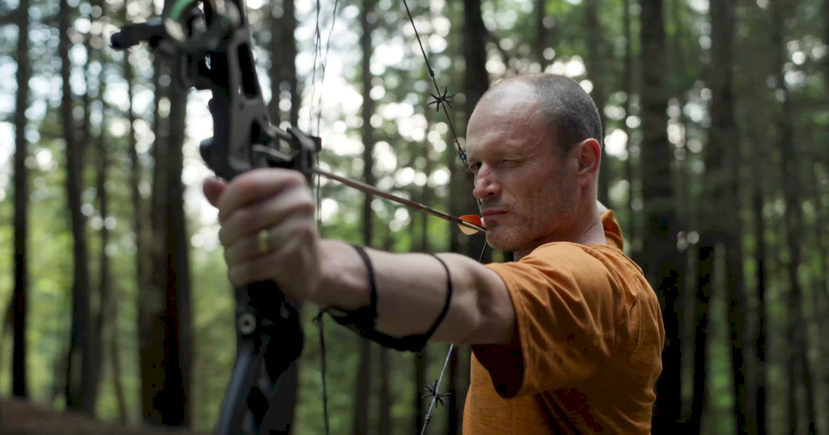 [Zbliżenie na dorosłego mężczyznę, który celuje z łuku do celu]