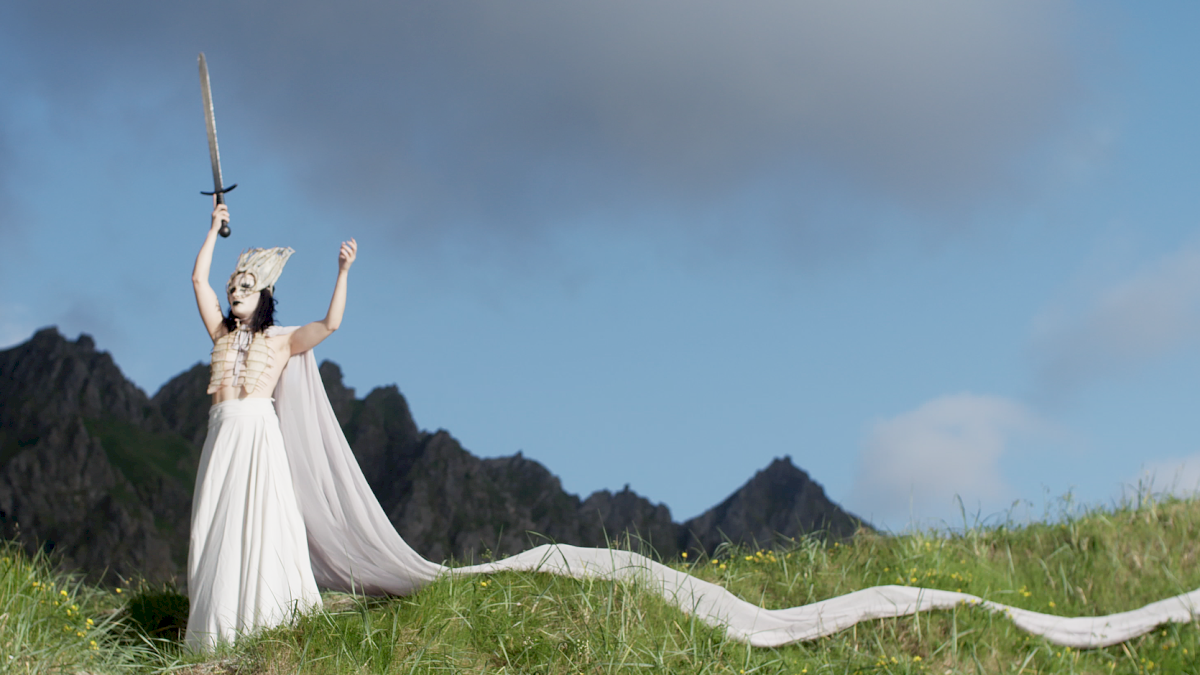 [Kobieta ubrana w białą długą suknię, z mieczem w dłoni, stoi na górskiej polanie i wznosi miecz ku niebu]